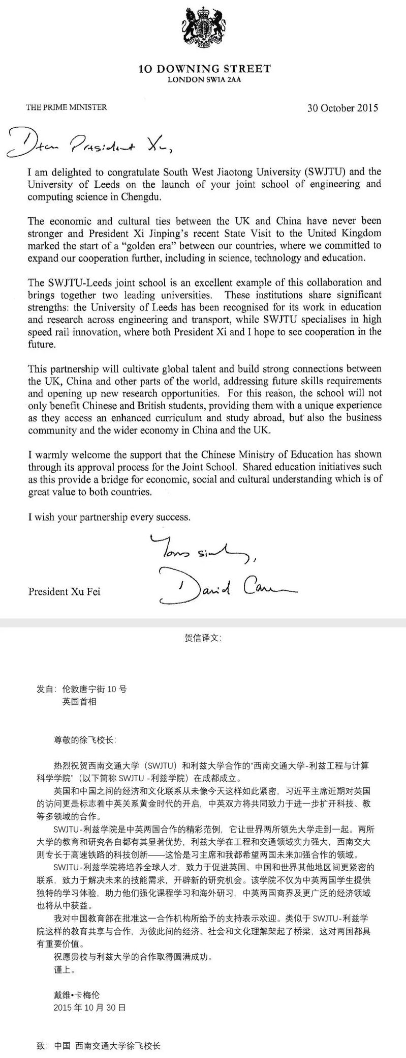 西南交通大学-利兹学院是经中国教育部批准,由中国西南交通大学与英国利兹大学合作创立的新型中外合作办学机构。学院定位于精英教育,是根据全球经济和社会发展需要,依托双方优质教育教学资源,在工程相关领域建立的一所高水平的高等教育机构。经过近三年的沟通磋商和筹备,2015年10月30日西南交大-利兹学院成立,时任英国首相戴维·威廉·唐纳德·卡梅伦(David William Donald Cameron)(第53任首相)向西南交大时任校长(第65任校长)徐飞发来贺信。此为贺信全文和译文: