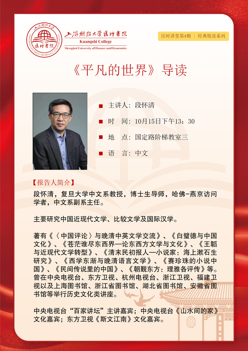 【报告人简介】段怀清,复旦大学中文系教授,博士生导师,哈佛-燕京访问学者,中文系副系主任。主要研究中国近现代文学、比较文学及国际汉学。著有《〈中国评论〉与晚清中英文学交流》、《白璧德与中国文化》、《苍茫谁尽东西界一论东西方文学与文化》、《王韜与近现代文学转型》、《清末民初报人一小说家:海上漱石生研究》、《西学东渐与晚清语言文学》、《赛珍珠的小说中国》、《民间传说里的中国》、《朝觐东方:理雅各评传》等。曾在中央电视台、东方卫视、杭州电视台、浙江卫视、福建卫视以及上海图书馆、浙江省图书馆、湖北省图书馆、安徽省图书馆等举行历史文化类讲座。中央电视台“百家讲坛”主讲嘉宾;中央电视台《山水间的家》文化嘉宾;东方卫视《斯文江南》文化嘉宾。