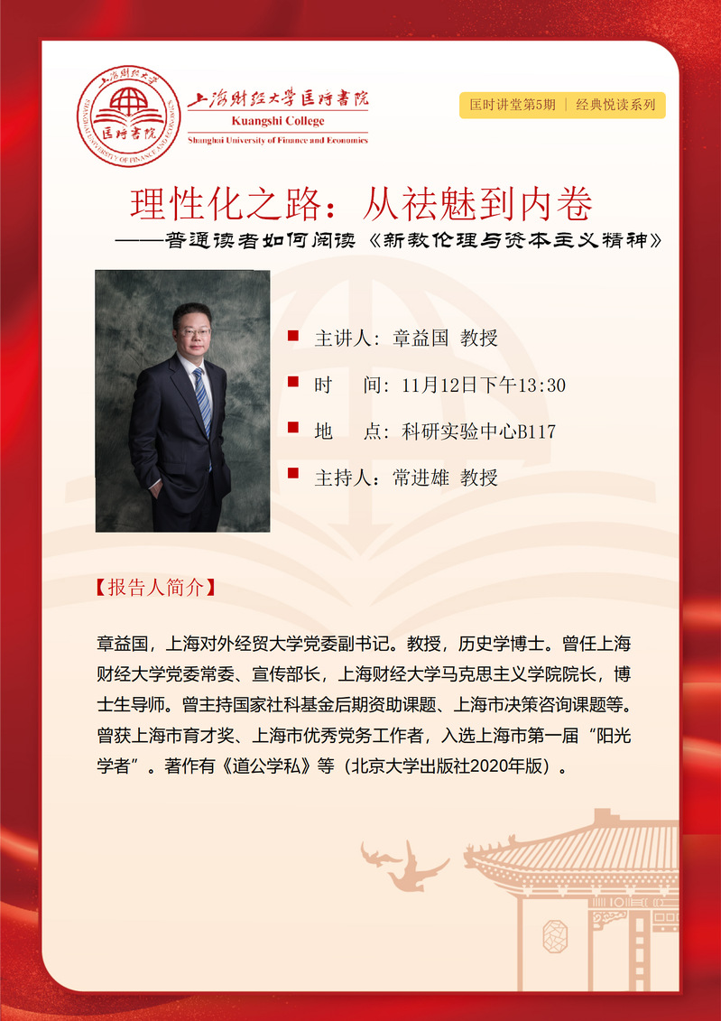 【报告人简介】章益国,上海对外经贸大学党委副书记。教授,历史学博士。曾任上海财经大学党委常委、宣传部长,上海财经大学马克思主义学院院长,博士生导师。曾主持国家社科基金后期资助课题、上海市决策咨询课题等。曾获上海市育才奖、上海市优秀党务工作者,入选上海市第一届“阳光学者”。著作有《道公学私》等(北京大学出版社2020年版)。