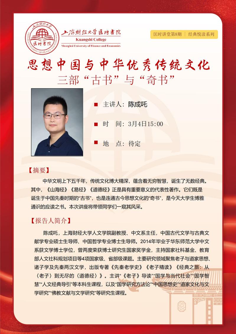 【报告人简介】陈成吒,上海财经大学人文学院副教授、中文系主任,中国古代文学与古典文献学专业硕士生导师、中国哲学专业博士生导师。2014年毕业于华东师范大学中文系获文学博士学位,曾两度荣获博士研究生国家奖学金,主持国家社科基金、教育部人文社科规划项目等4项国家级、省部级课题。主要研究领域聚焦老子与道家思想、诸子学及先秦两汉文学,出版专著《先秦老学史》《老子精读》《经典之旅:从〈老子〉到无尽的〈道德经〉》。主讲“《老子》导读”“国学与当代社会”“国学智慧”“人文经典导引”等本科生课程,以及“国学研究方法论”“中国思想史”“道家文化与文学研究”“佛教文献与文学研究”等研究生课程。